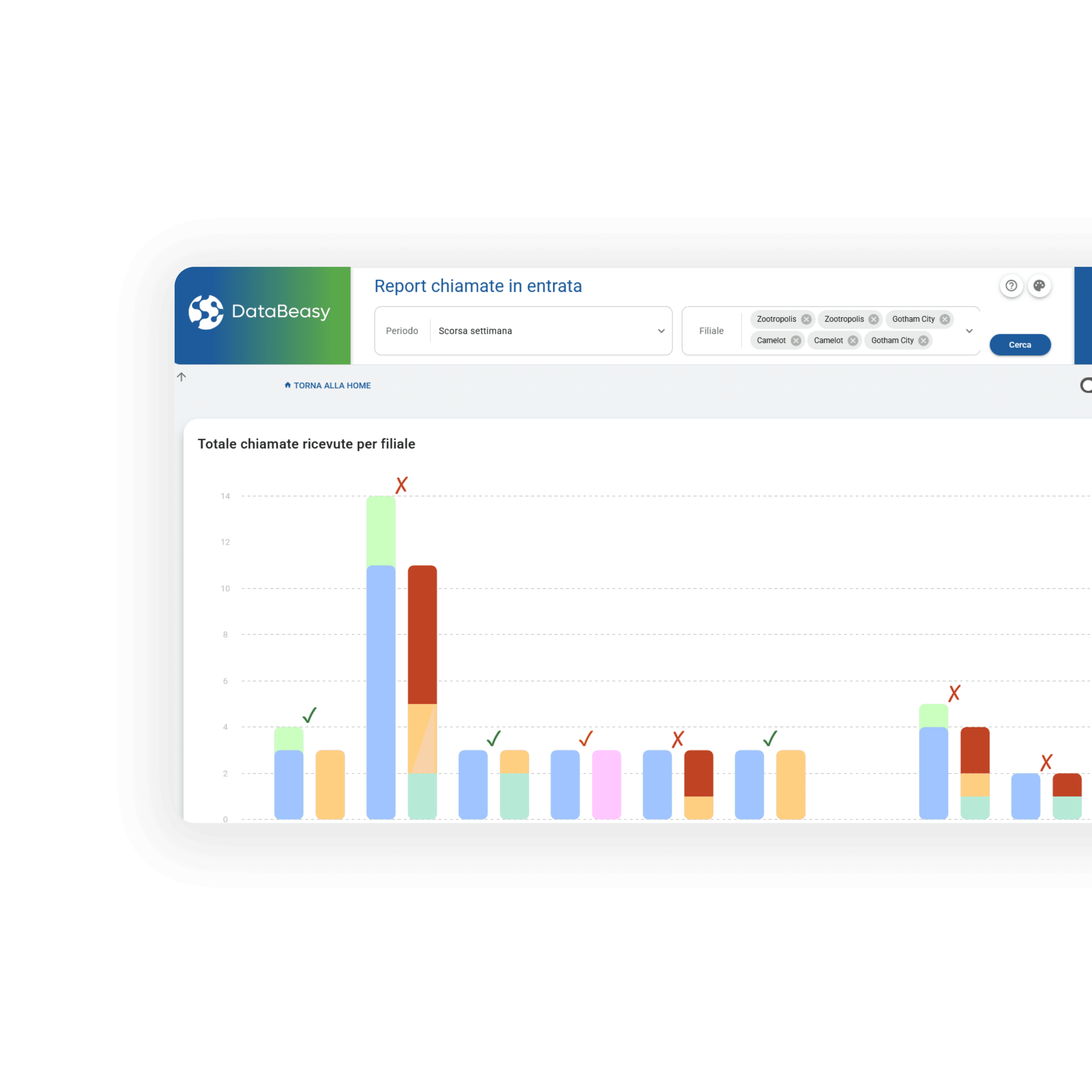 Tieni sotto controllo il flusso telefonico con metriche 100% attendibili. DataBeasy isola i "numeri unici" per ignorare i tentativi ripetuti e calcola i tempi di attesa reali. Potrai monitorare esattamente in quali fasce orarie si concentrano le chiamate perse e riorganizzare il lavoro in tempo reale.